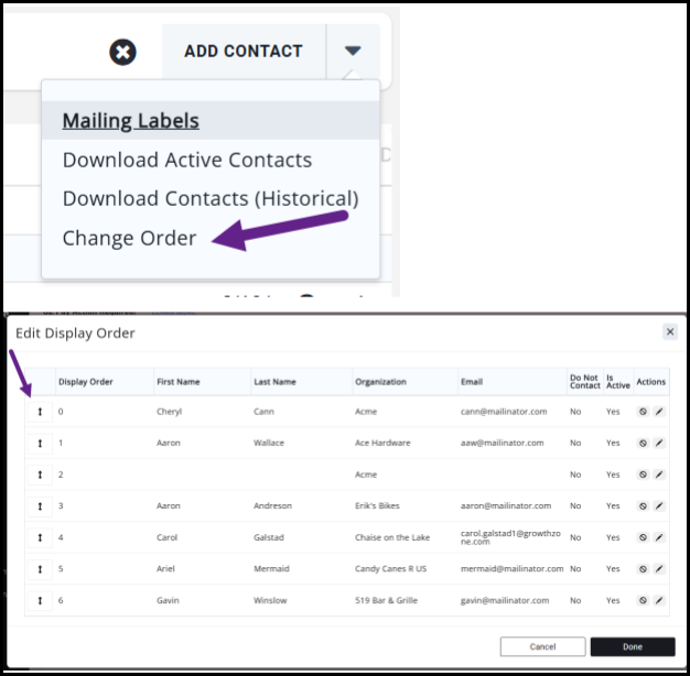 - To order your List/Committee members, you can access the Change Order option in the menu. The reason you can order your List/Committee members is to display the order as desired on any public lists/committee pages. Drag and drop the contacts to the desired order. The numbers will automatically adjust to your designated order.
