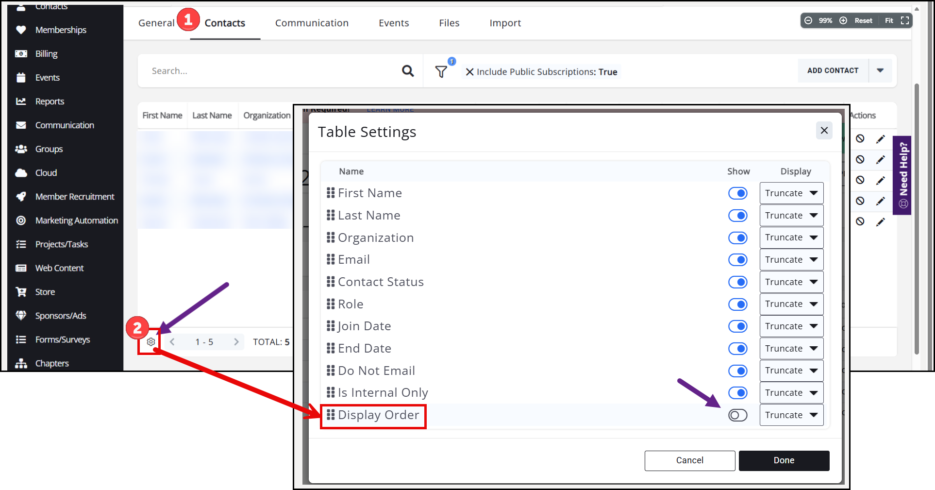 TIP: You have an optional column to enable on this table called Display Order. This column means you don't have to click into each contact to see their selected order. Turn this option on by going to the Setup gear icon in the bottom left corner of the Contacts tab.