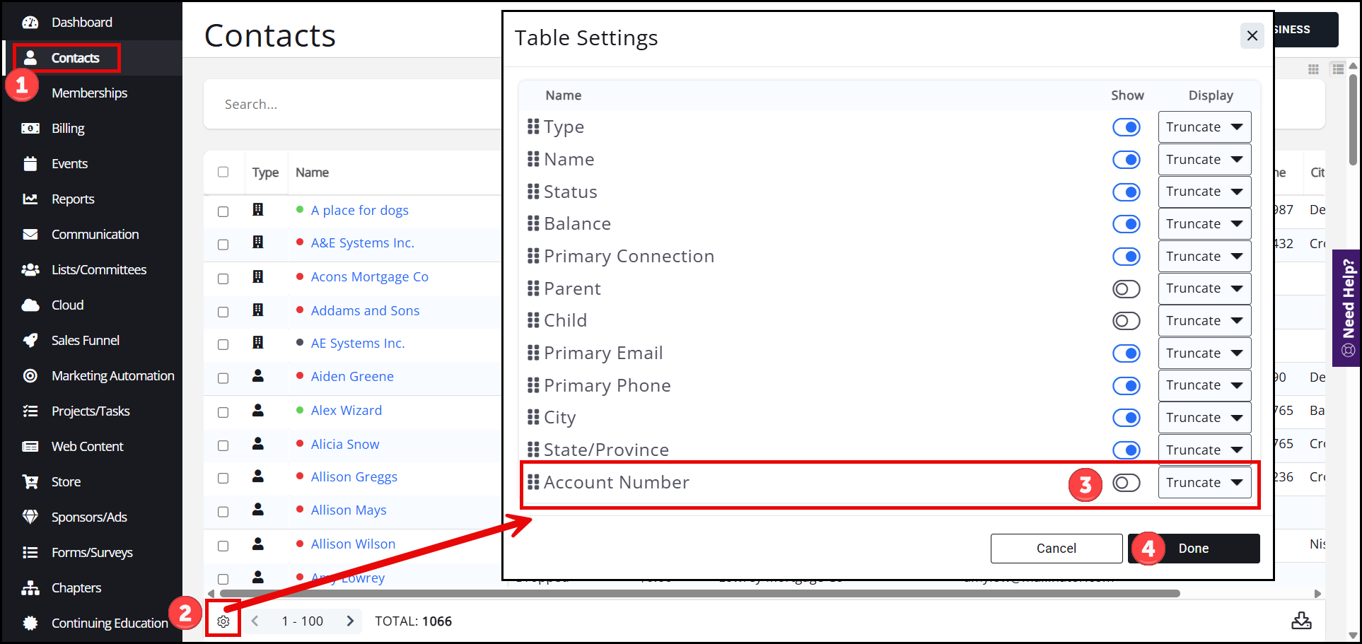 Tip: Once set up, you can search for the Account Number in the search box at the top of the Contacts module.